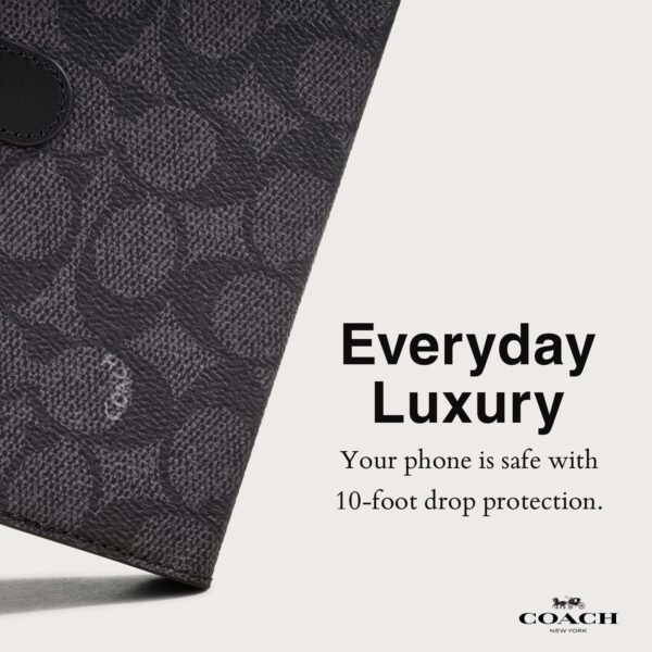 Signature required— the Coach Folio Case in Signature C for iP 15 Pro Max holds all your essentials in a sleek design. Featuring 3 card slots and a pocket for cash. you can carry your essentials in a removable folio case. Bring luxury to your everyday accessory with a 10ft drop protection and thin case profile that doesn’t interfere with wireless charging.